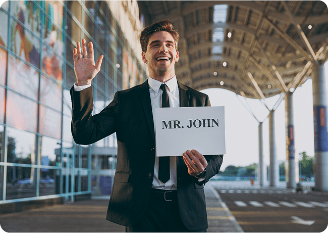 Warm VIP Welcome by a professionally dressed chauffeur at the arrival gate.
