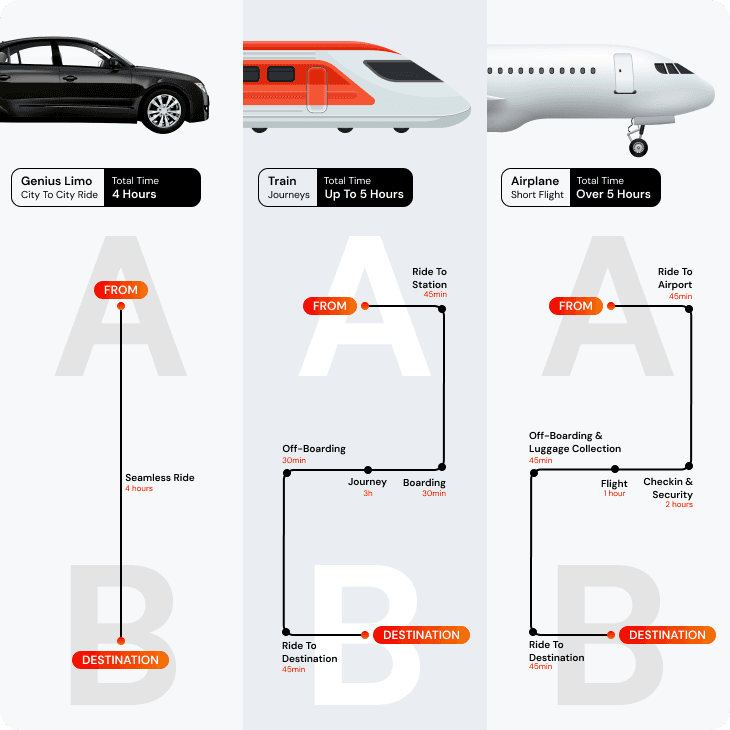 Skip the hassle of short flights, regional trains, or rental cars, and experience the ease and comfort of our city-to-city private car service. Discover why more travelers are choosing chauffeured rides as a premium alternative: