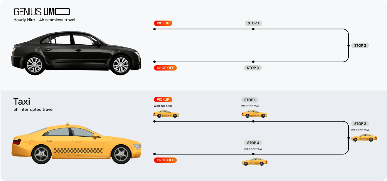 Say goodbye to switching transportation modes when your day involves multiple stops. With Genius Limo, there’s no need to wait for taxis, navigate crowded public transport, or deal with rental car parking. Enjoy the freedom of having a professional chauffeur at your service—wherever the day takes you.